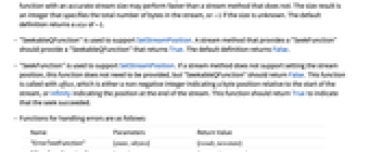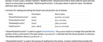 Name Parameters Return Value "StreamPositionFunction" {state} {position,newstate} "StreamSizeFunction" {state} {size,newstate} "SeekableQFunction" {state} {flag,newstate} "SeekFunction" {state,offset} {success,newstate} - "StreamPositionFunction" is used to support StreamPosition. The position result is an integer that specifies the position of the current point in the open stream. A position of -1 indicates that the stream position is unknown. The default definition returns a position of -1.