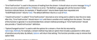 Name Parameters Return Value "ErrorTextFunction" {state,nbytes} {result,newstate} "ClearErrorFunction" {state} {ignored,newstate} - "ErrorTextFunction" is used in the process of reading from the stream. It should return an error message String if there is an error condition and Null if there is no error. The Wolfram Language will call this function if other functions indicate failure, for example, if "ReadFunction" returns fewer bytes than requested and "EndOfFileQFunction" returns False. The default definition returns a result of Null.