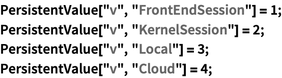 "KernelSession" current invocation of the Wolfram Language kernel "FrontEndSession" current invocation of the Wolfram Notebook front end "Notebook" the notebook in which the current evaluation is being done "ServerSession" persistence for requests on a single web server "CookieManaged" persistence based on a Wolfram browser cookie "Local" local to a computer, based on user home directory "LocalShared" local to a computer, based on $BaseDirectory "Cloud" in the cloud defined by the current $CloudBase "Installation" installation defaults - PersistentValue["name"] is equivalent to PersistentValue["name",$PersistencePath].