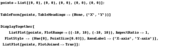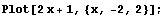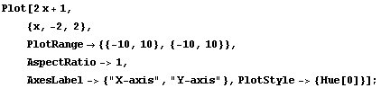 has been graphed again, but this new graph labels the x- and y-axes, and displays both axes from -10 to 10. It even shows the linear equation as a red line (PlotStyle->{Hue[0]}).