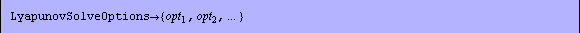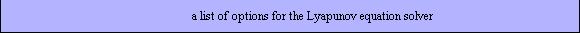 Since a Lyapunov equation must be solved at each iteration step of the Newton method and there are several options for the function LyapunovSolve, Advanced Numerical Methods allows a list containing these options to be passed to the Lyapunov equation solver through the option LyapunovSolveOptions. By default, the automatic Lyapunov solver is used.