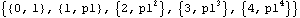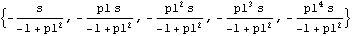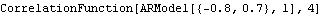 These are the covariances at lags 0, 1, ..., 4. Note that the first entry in the output is (0), the variance of the series. To get the correlation function we need to divide the above result by its first entry (0). This can be done explicitly as follows. The correlation function of the AR(1) model is calculated up to lag 4. The expression %[[1]] represents the first element of the last output. Out[16]= |  |