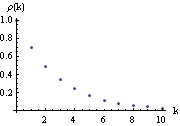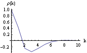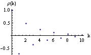 The output can then be used as the argument of ListPlot. It is convenient to define a function that takes the output of CorrelationFunction and does the appropriate plot so the data does not need to be manually processed every time we plot the correlation function. We will choose to use the DataRange option to ListPlot and define the function plotcorr as follows. This defines plotcorr for plotting correlation functions. The first argument in plotcorr is the output of CorrelationFunction and the second is the usual set of options for ListPlot. Next we display the two typical forms of the correlation function of an AR(1) process, one for positive 1(=0.7) and one for negative 1(=-0.7) using the function plotcorr. (Since the correlation function of a univariate time series is independent of the noise variance, we set 2=1.) This calculates the correlation function up to lag 10. The semicolon at the end of the command prevents the display of the output. This is the plot of the correlation function. Out[22]= |  |