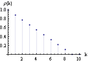 To emphasize the discrete nature of the correlation function some people prefer to plot the correlation function as discrete lines joining the points {i, 0} and {i, (i)} for i=0, 1, ... , h. It is easy to implement this type of plot in Mathematica, via ListPlot with a Filling option. The function defined above is used to plot the correlation function of the MA(8) model with equal  weights. Out[28]= |  |