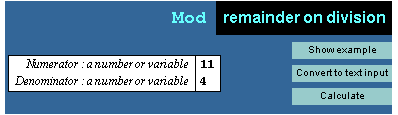 Here is the InstantCalculator for the Mod function. Enter the parameters for your calculation and click Calculate to see the result.