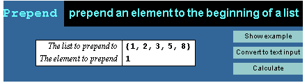 Here are the InstantCalculators for the Prepend function. Enter the parameters for your calculation and click Calculate to see the result.