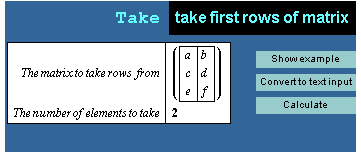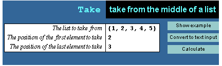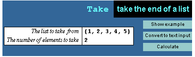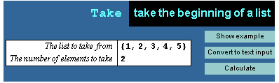 Here are the InstantCalculators for the Take function. Enter the parameters for your calculation and click Calculate to see the result.