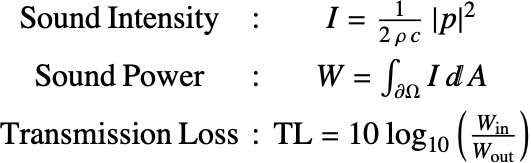 Another important quantity to measure the performance of an acoustic muffler is the transmission loss (TL), which is defined as the ratio between the incident and the transmitted sound power. The formulas for the transmission loss, sound power and sound intensity are given by: