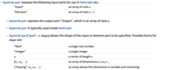 "Real" 単一の実数 "Integer" 単一の整数 n 長さ n のベクトル {n1,n2,…} 次元 n1×n2×…の配列 {"Varying",n2,n3,…} 第1次元が可変長で残りの次元が n2×n3×…の配列 - AppendLayer[…][<|"Input"in,"Element"elem|>]は,この層を適用した結果の出力を明示的に計算するが,これは実質的にAppend[in,elem]に等しい.
