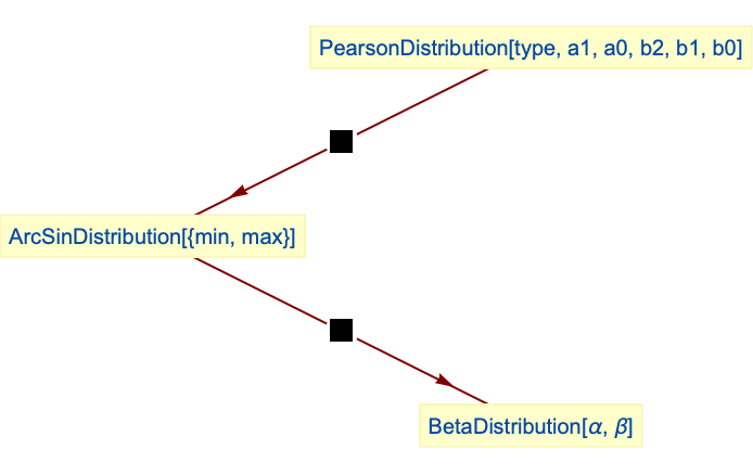 - 逆正弦分布は多くの他の分布と密接に関係している.例えば,標準逆正弦分布ArcSinDistribution[{0,1}]は,ベータ分布BetaDistribution[1/2,1/2]と厳密に等しい.結果として,ArcSinDistributionはBetaDistributionの多くの関係を継承する.ArcSinDistributionは,同様に,PDF[ArcSinDistribution[{0,1}],x]がPDF[PearsonDistribution[1,1,-1/2,1,-1,0],x]と等しいという意味において,タイプ1のPearsonDistributionであると見ることができる.これは,UniformDistribution,PERTDistribution,ChiSquareDistribution,GammaDistribution,BetaPrimeDistributionとも密接に関係している.
