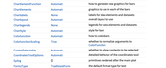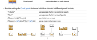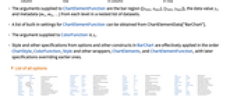 "Column" パネルの列で別々のグラフを使う "Row" パネルの行で別々のグラフを使う {"Column",k},{"Row",k} k 列(または行)を使う {"Column",UpTo[k]},{"Row",UpTo[k]} 最高で k 列(または行)を使う - ChartElementFunctionに渡される引数は,棒の範囲{{xmin,xmax},{ymin,ymax}},データ値 yi,データ集合のネストしたリストにおける各レベルからのメタデータ{m1,m2,…}である.