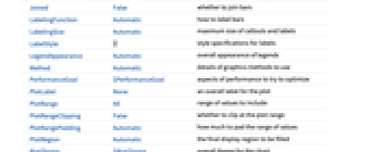 AspectRatio 1/GoldenRatio 縦横比 Axes True 軸を描くかどうか BarOrigin Bottom 棒の始点 BarSpacing Automatic 棒と棒の間隔 ChartBaseStyle Automatic 棒の全体的なスタイル ChartElementFunction Automatic 棒の生のグラフィックスをどのように生成するか ChartElements Automatic 各棒に使うグラフィックス ChartLabels None データ要素とデータ集合のラベル ChartLayout Automatic 使用する全体的なレイアウト ChartLegends None データ要素とデータ集合の凡例 ChartStyle Automatic 棒のスタイル ColorFunction Automatic 棒の彩色方法 ColorFunctionScaling True ColorFunctionの引数を正規化するかどうか IntervalMarkers Automatic 不確かさをどのように描画するか IntervalMarkersStyle Automatic 不確かな要素のスタイル Joined False 棒を繋ぐかどうか LabelingFunction Automatic 棒にどのようにラベルを付けるか LabelingSize Automatic コールアウトとラベルの最大サイズ LegendAppearance Automatic 凡例の全体的な外観 PerformanceGoal $PerformanceGoal パフォーマンスのどの面について最適化するか PlotInteractivity $PlotInteractivity インタラクティブな要素を許可するかどうか PlotTheme $PlotTheme グラフの全体的なテーマ ScalingFunctions None 個々の座標をどのようにスケールするか TargetUnits Automatic グラフ中に表示する単位 - 単一の表示パネルで複数のデータ集合を表示するChartLayoutの可能な設定には以下がある.