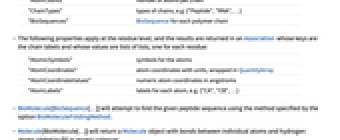 "ResidueCounts" 每条链的残基的数量 "ResidueAbbreviations" 残基标签的列表,如 {"GLY","PRO",…} "ResidueIDs" 数字标识符 "AuthorResidueIDs" 原作者提供的数字标识符 "AtomCounts" 每条链上原子的数量 "ChainTypes" 链的类型,如 {"Peptide","RNA",…} "BioSequences" 每个聚合物链的 BioSequence "BackboneCoordinates" 主干坐标组成的 QuantityArray,"CA" 为肽,"O3" 为核酸 "PeptideTorsionAngles" 肽