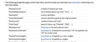 "ChainCount" 鎖の数 "ChainIDs" 鎖のIDのリスト.例:{"A","B",…} "AuthorChainIDs" 原著者によって与えられた鎖のIDのリスト "PolymerChainCount" ポリマー鎖の数 "PolymerChainLabels" ポリマー鎖のラベルのリスト "ResidueCount" すべての鎖の残基の数 - 以下の特性は鎖レベルで適用され,結果はキーが鎖のラベルであるAssociationで返される.