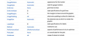 None 没有仪表标签 Automatic 以标签形式包含单位 Full 以标签形式包含单位和数值 All 以标签形式包含所有数值 "Value" 以标签形式包含数值 "Unit" 以标签形式包含单位 label 将 label 作为标签使用 Placed[label,pos] 在位置 pos 处放置 label {label1,label2,…} 使用多个标签 - GaugeLabels->Placed[label,pos] 可以使用位置 pos: