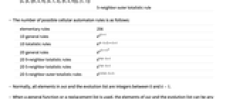 {n,{k,1},{1,1}} 9 近邻极权规则 {n,{k,{{0,1,0},{1,1,1},{0,1,0}}},{1,1}} 5 近邻极权规则 {n,{k,{{0,k,0},{k,1,k},{0,k,0}}},{1,1}} 5 近邻外部极权规则 - 元胞自动机规则的可能数量如下: