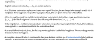 - 在一维元胞自动机中,替换规则或明确函数 fun 可以用于一维近邻列表. 若近邻指定明确偏移量,则它们按偏移量顺序给定.