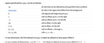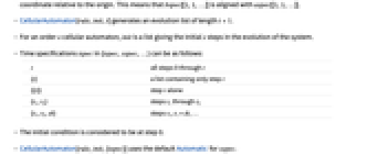 All 受指定的初始情况影响的所有元胞 Automatic 与背景不同的区域内的所有元胞 0 与 aspec 的开始对齐的元胞 x 向右的偏移量至多为 x 的元胞 -x 向左的偏移量至多为 x 的元胞 {x} 向右的偏移量为 x 的元胞 {-x} 向左的偏移量为 x 的元胞 {x1,x2} 偏移量为 x1 到 x2 的元胞 {x1,x2,dx} 元胞 x1, x1+dx, … - 一维时,aspec 的第一个元素在缺省的情况下有空间偏移量 0.