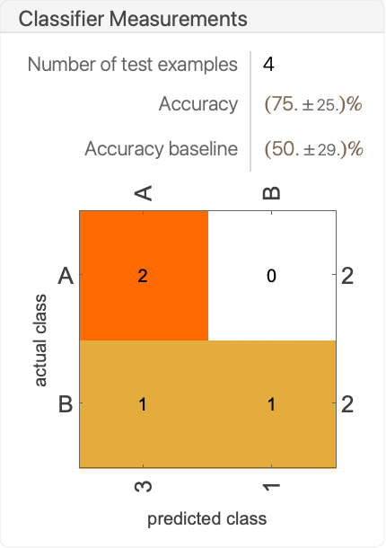 - 如 "Precision" 或 "Recall" 这样的属性为每个可能的“正类”给出一个测量值. “负类”是所有非“正类”的类的组合. 对于这样的属性,我们可以用 ClassifierMeasurementsObject[…][propaverage] 求所有可能的正类的测量值的平均值,其中 average 可以是: