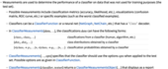 {class1,class2,…} 来自分类器的分类(人类、算法等) {dist1,dist2,…} 分类器获取的类别分布 {<|class1p1,…|>,<|class1q1,…|>,…} 分类器获取的分类概率 - ClassifierMeasurements[…,opts] 指定分类器在应用于测试集时应使用选项 opts. ClassifierFunction 给出了可能的选项.