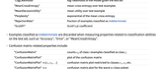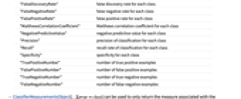 "AreaUnderROCCurve" 每个类别的 ROC 曲线下的面积 "ClassMeanCrossEntropy" 每个类别的平均交叉熵 "ClassRejectionRate" 每个类别的拒绝率 "F1Score" 每个类别的 F1 值 "FalseDiscoveryRate" 每个类别的错误发现率 "FalseNegativeRate" 每个类别的假负类率 "FalsePositiveRate" 每个类别的假正类率 "MatthewsCorrelationCoefficient" 每个类别的 Matthews 相关系数 "NegativePredictiveValue" 每个类别的负例命中率 "Precision" 每个类别的分类的精确度 "Recall" 每个类别的分类的召回率 "Specificity" 每个类别的特异性 "TruePositiveNumber" 真正类实例的数量 "FalsePositiveNumber" 假正类实例的数量 "TrueNegativeNumber" 真负类实例的数量 "FalseNegativeNumber" 假负类实例的数量 - ClassifierMeasurementsObject[…][propclass] 可用来仅返回与指定类别关联的测量值.