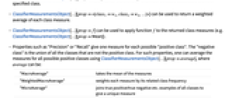 "MacroAverage" 所有测量值的统一平均值 "WeightedMacroAverage" 根据相关的类的频次对每个测量值进行加权 "MicroAverage" 合并真正类/真负类等实例,给出唯一的测量值 - 其他属性包括: