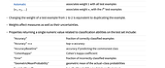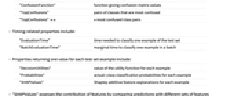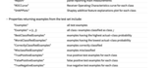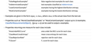 "Examples" 所有测试实例 "Examples"{i,j} 被划分为 j 类的所有 i 类实例 "BestClassifiedExamples" 实际类别概率最高的实例 "WorstClassifiedExamples" 实际类别概率最低的实例 "CorrectlyClassifiedExamples" 被正确分类的实例 "MisclassifiedExamples" 被错误分类的实例 "TruePositiveExamples" 每个类别的真正类测试实例 "FalsePositiveExamples" 每个类别的假正类测试实例 "TrueNegativeExamples" 每个类别的真负类测试实例 "FalseNegativeExamples" 每个类别的假负类测试实例 "IndeterminateExamples" 被划分为 Indeterminate 的测试实例 "LeastCertainExamples" 分布熵最高的实例 "MostCertainExamples" 分布熵最低的实例 - 以 inputiclassi 形式给出实例,其中 classi 是测试集中实例的实际类别.