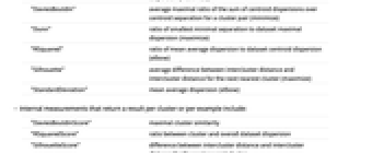 "CalinskiHarabasz" 平均分離と平均重心分離との比(最大化) "DaviesBouldin" クラスタペアの重心分離に対する重心分散の合計の平均最大比 (最小化) "Dunn" データ集合の最大分散に対する最小の最小分離の比率 (最大化) "RSquared" データ集合の重心分散に対する平均分散の比率 (屈曲) "Silhouette" クラスタ間距離と次に近いクラスタのクラスタ間距離の平均差 (最大化) "StandardDeviation" 平均分散 (屈曲) - クラスタまたは例を介して結果を返す内部測定値には以下がある.