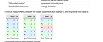 "Purity" クラスタ内で最も一般的なグラウンド トゥルースの割当てを持つ例の割合(最大化) "Rand" 同じグラウンド トゥルース割当てを正しく共有する,または共有しない(ei,ej)ペアの割合(最大化) - 次は,クラスタまたは例を介して結果を返す外部測定である.