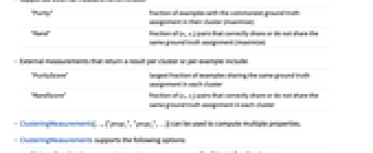 - ClusteringMeasurementsはクラスタリング過程の結果の分析に使われる.クラスタ化されたデータに単独で使ったり,グランドトゥルース情報でそれらを比較したりすることができる.