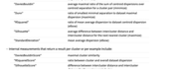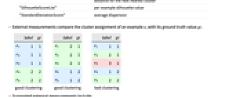 "Purity" 簇中按最多的真实值分配的样例的比例(最大化) "Rand" 正确共享或不共享相同的真实值分配的 (ei,ej) 数据对的比例(最大化) - 为每个聚类或每个样例返回结果的外部度量包括: