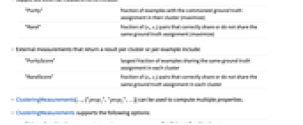 "PurityScore" 每个簇中共享相同真实值分配的样例的最大比例 "RandScore" 每个簇中正确共享或不共享相同的真实值分配的 (ei,ej) 数据对的比例 - ClusteringMeasurements[…,{"prop1","prop2",…}] 可用于计算多个属性.