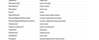 "AverageDistanceFromEarth" 地球からの平均距離 "AverageOrbitDistance" 平均軌道距離 "AverageOrbitVelocity" 平均軌道速度 "AverageVelocityAroundSun" 平均日心速度 "Azimuth" 方位角 "BooleanRise" 地平線上 "Classes" クラス "Constellation" 星座 "DailyTimeAboveHorizon" 地平線の上にある1日の時間 "Declination" 赤緯 "DestructionDate" 崩壊日 "Diameter" 平均直径 "DiscoveryYear" 発見年 "DistanceFromEarth" 地球からの距離 "DistanceFromSun" 太陽からの距離 "EarthMOID" 地球軌道との交差点までの最短距離 "EccentricAnomaly" 離心近点角 "Eccentricity" 軌道の離心率 "EquatorialDiameter" 赤道直径 "EquatorialRadius" 赤道半径 "FarthestPlanet" 最も遠くにある太陽系の惑星 "GalacticLatitude" 銀緯 "GalacticLongitude" 銀経 "GeocentricEclipticLatitude" 地心黄道緯度 "GeocentricEclipticLongitude" 地心黄道経度 "GreenwichHourAngle" グリニッジ時角 "HeliocentricLatitude" 日心黄道緯度 "HeliocentricLongitude" 日心黄道経度 "HelioCoordinates" 日心XYZ座標 "IAUName" IAU名 "Inclination" 軌道傾斜 "LocalHourAngle" 地方時角 "MajorAxis" 長軸 "MeanAnomaly" 平均近点角 "MeanMotion" 平均運動 "MinorAxis" 短軸 "Name" 名前 "NearestPlanet" 最も近くにある太陽系の惑星 "NuclearMagnitudeParameter" 核光度パラメータ "NuclearMagnitudeSlopeParameter" 核光度傾斜パラメータ "OrbitCenter" 軌道の中心 "OrbitCircumference" 軌道の外周 "OrbitPath" 軌道経路 "OrbitPeriod" 軌道周期 "OrbitRules" 軌道規則 "Periapsis" 軌道の中心からの最短距離 "PeriapsisArgument" 近点 の偏角