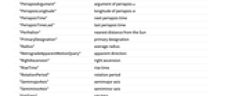 "Age" 年齢 "AlphanumericName" 英数字による名前 "AlternateNames" 別名 "Altitude" 高度 "AngularDiameterFromEarth" 地球から見える角直径 "AngularRadiusFromEarth" 地球から見える角半径 "Aphelion" 太陽からの最大距離 "Apoapsis" 軌道の中心からの最大距離 "ApoapsisTime" 次の軌道遠点時 "ApoapsisTimeLast" 直前の軌道遠点時 "ApparentAltitude" 視高度 "ApparentMagnitude" 視等級 "AscendingNodeLongitude" 昇交点 の経度