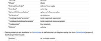 "PeriapsisTime" 次の近点時 "PeriapsisTimeLast" 直前の近点時 "Perihelion" 太陽からの最短距離 "PrimaryDesignation" 主記号表示 "Radius" 平均半径 "RetrogradeApparentMotionQuery" 見かけの方向 "RightAscension" 赤経 "RiseTime" 出の時刻 "RotationPeriod" 回転周期 "SemimajorAxis" 半長軸 "SemiminorAxis" 半短軸 "SetTime" 入の時刻 "Shape" 形 "SiderealHourAngle" 恒星時角 "SolarDay" 太陽日 "SphereOfInfluenceRadius" 影響半径の球 "SurfaceArea" 表面積 "TotalMagnitudeParameter" 全光度パラメータ "TotalMagnitudeSlopeParameter" 全光度傾斜パラメータ "TrueAnomaly" 真近点 "Volume" 体積 - 特性の中には全体としてCometDataに使え,CometData[property]の形を使って与えられるものがある.次はそのような特性である.