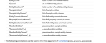 "Entities" 使用可能なすべての実体 "EntityCount" 使用可能な実体の総数 "Classes" 使用可能なすべての実体クラス "EntityClassCount" 使用可能な実体クラスの総数 "SampleEntities" サンプル実体のリスト "SampleEntityClasses" サンプル実体クラスのリスト "EntityCanonicalNames" すべての実体の正規名のリスト "PropertyCanonicalNames" すべての特性の正規名のリスト "EntityClassCanonicalNames" すべての実体クラスの正規名のリスト "RandomEntities" 擬似ランダムサンプル実体 {"RandomEntities",n} n 個の擬似ランダム実体 "RandomEntityClasses" 擬似ランダムサンプル実体のクラス {"RandomEntityClasses",n} n 個の擬似ランダム実体クラス - 次の注釈をCometData[entity,property,annotation]の第3引数として使うことができる.