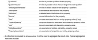 "Qualifiers" 特性の可能な限定子のリスト "QualifierValues" 各限定子に与えることができる値のリスト "DefaultQualifierValues" 特性の限定子のデフォルト値のリスト "Description" 特性のテキストによる簡単な説明 "Definition" 特性のテキストによる詳細な定義 "Source" 特性の出典情報 "Date" 実体と特性のペアの値があれば,それに関連した日付 "PhysicalQuantity" 実体と特性のペアの値に関連した物理量 "Unit" 実体と特性のペアの値に関連した単位 "EntityAssociation" 実体および実体と特性のペアの値の連想 "PropertyAssociation" 特性および実体と特性のペアの値の連想 - 関数が annotation として与えられている場合,これは結果のデータを集約するのに使われる.次はよく使われる集約関数である.