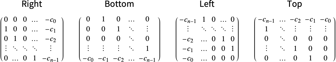 - CompanionMatrix[c,dir]は dir を使って結果の行列の配置を決定する.これは,Right(デフォルト),Bottom,Left,Topのいずれかでなければならない.c の係数はこの指示子を使って置かれる.