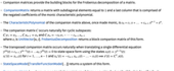 はUnitVector[n,i]である.FrobeniusDecompositionはこの形式のブロック同伴行列を返す. - 転置された同伴行列は,単一の微分方程式