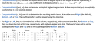 - CompanionMatrix[c]は,デフォルトで,下対角成分が1に等しく最終列がモニック特性多項式の係数の符号を反転したものからなる行列を返す.