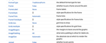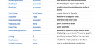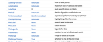 Axes True 是否绘制坐标轴 Joined False 是否将每个点都连起来 LabelingFunction Automatic 如何标记点 LabelingSize Automatic callout 和标签的最大尺寸 PerformanceGoal $PerformanceGoal 优化的目标 PlotHighlighting Automatic 突出显示曲线的效果 PlotLabel None 绘图的整体标签 PlotLabels None 数据的标签 PlotLegends None 数据的图例 PlotMarkers None 用于指明每个点的标记 PlotRange Automatic 包含的值范围 PlotRangeClipping True 在绘图范围边界处是否进行剪切 PlotStyle Automatic 确定点的样式的图形指令 PlotTheme $PlotTheme 绘图的整体外观主题 PolarAxes False 是否绘制极坐标轴 PolarAxesOrigin Automatic 在何处绘制极坐标轴 PolarGridLines None 极坐标网格线 PolarTicks Automatic 极坐标刻度 ScalingFunctions None 怎样缩放个别坐标 - ColorData["DefaultPlotColors"] 给出 PlotStyle 使用的默认颜色序列.