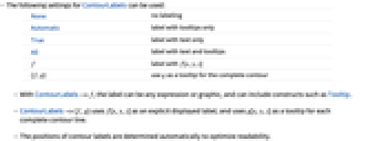 None 没有标签 Automatic 只带有工具提示的标签 True 只带有文本的标签 All 带有文本和工具提示的标签 f 带有 f[x,y,z]的标签 {f,g} 将 g 作为整个等高线的工具提示 - 通过设置 ContourLabels->f,标签可是任何表达式或图形,也可包括像 Tooltip 那样的结构.