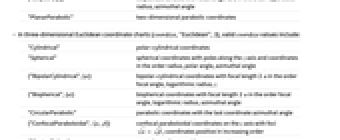 "Polar" 極座標 {"Bipolar",{a}} 焦点距離が2a で,焦点角度,対数半径の順の二極座標 {"Elliptic",{a}} 焦点距離が2a で,双曲線半径,方位角の順の楕円座標 "PlanarParabolic" 二次元放物線座標 - 三次元ユークリッド座標チャート{coordsys,"Euclidean",3}の有効な coordsys 値には以下がある.
