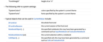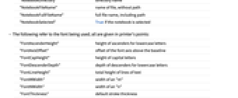 "NotebookDirectory" ディレクトリ名 "NotebookFileName" ファイル名,パスは含まない "NotebookFullFileName" 完全ファイル名,パスを含む "NotebookSelected" ノートブックが選択されていればTrue - 以下は使用されているフォントを参照する.値はすべてプリンタポイントで与えられる.