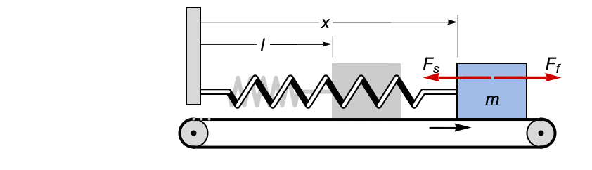 バネによって壁に固定された稼働中のコンベヤーベルト上のブロックをモデル化する.ブロックの体積,ベルトの速度,摩擦係数等,系のさまざまなパラメータの値について,その位置と速度を比較する: