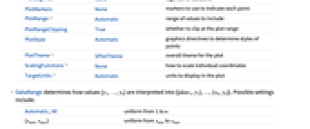 Automatic,All 均匀地从 1 到 n {xmin,xmax} 均匀地从 xmin 到 xmax - 一般来说,一组数值对 {{x1,y1},{x2,y2},…} 会被解释成一组点,但设置 DataRangeAll 会把它强制解释成多个数据 {{y11,y12},{y21,y23},…}.