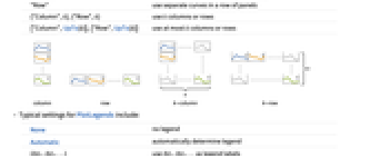 "Column" 在一列面板中分别显示曲线 "Row" 在一行面板中分别显示曲线 {"Column",k},{"Row",k} 采用 k 行或列 {"Column",UpTo[k]},{"Row",UpTo[k]} 最多采用 k 行或列 - PlotLegends 的典型设置包括: