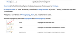 None 无图例 Automatic 自动确定图例 {lbl1,lbl2,…} 用 lbl1、lbl2、… 作为图例标签 Placed[lspec,…] 指定图例的位置 - ColorData["DefaultPlotColors"] 给出 PlotStyle 使用的默认颜色序列.