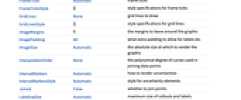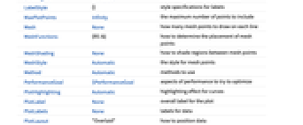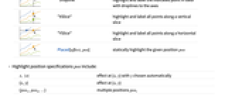 style 突出显示指定的数据 "Ball" 突出显示并标记数据中的指定点 "Dropline" 突出显示并为数据中的指定点添加标签,并在轴线上标出垂线 "XSlice" 突出显示并标记沿垂直切面的所有点 "YSlice" 突出显示并标记沿水平切面的所有点 Placed[effect,pos] 静态突出显示给定位置 pos - 突出显示位置 pos 的规约包括: