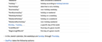 All 任何日历中的日期(默认) "Weekday" 被视为工作日的日期 "Weekend" 被视为周末的日期 "Holiday" 由 HolidayCalendar 规定的假期 "NonHoliday" 不是假期的日期 "BusinessDay" 非假期工作日 "NonBusinessDay" 假期或周末 "WeekdayHoliday" 发生在工作日的假期 "WeekendHoliday" 发生在周末的假期 "WeekendNonHoliday" 非假期的周末 Monday, Tuesday, … 一周的某一天 "EndOfMonth" 给定月份的最后一天 "BeginningOfMonth" 给定月份的第一天 - 在犹太历中,工作日是 Sunday 到 Thursday.